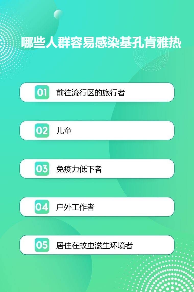 基孔肯雅热是一种由蚊子传播的病毒性疾病,人群普遍易感,尤其是前往流行区的旅行者、儿童、免疫力低下者、户外工作者、居住在蚊虫滋生环境者等。