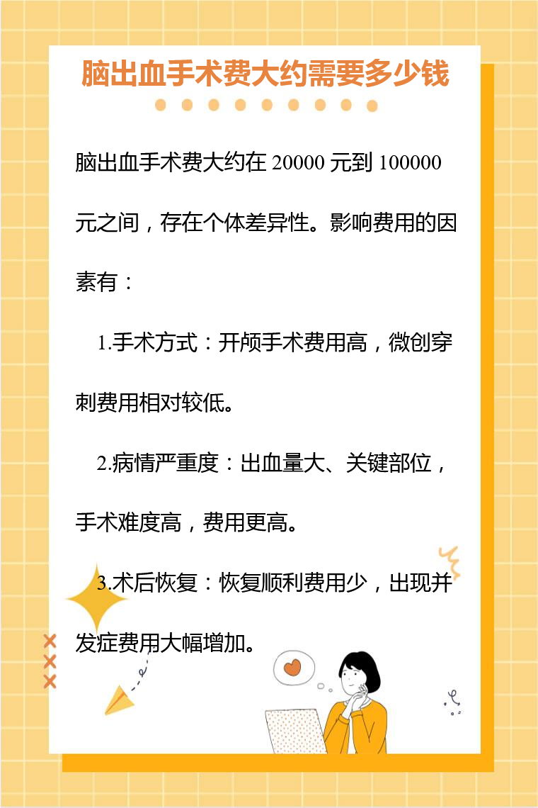 脑出血手术费大约在 20000 元到 100000 元之间,存在个体差异性。影响费用的因素有手术方式、病情严重程度、术后恢复情况等。