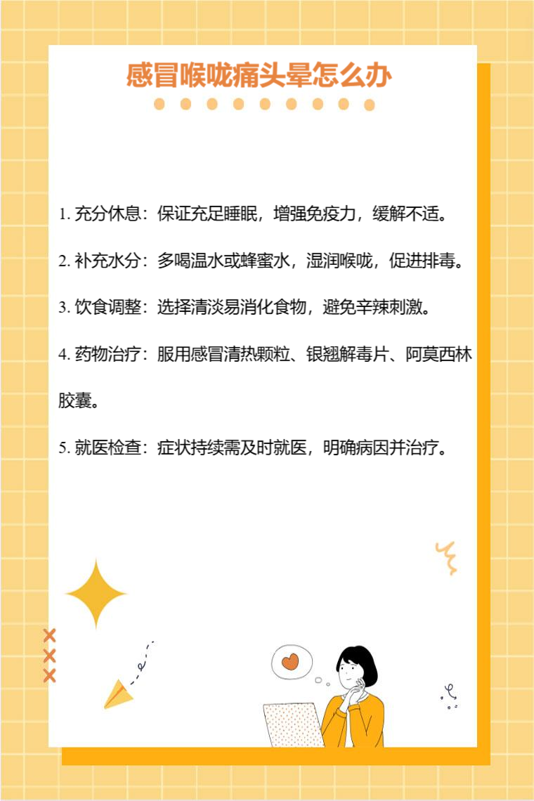 感冒喉咙痛头晕可通过休息、补充水分、饮食调整、药物治疗、就医检查等方法来缓解。