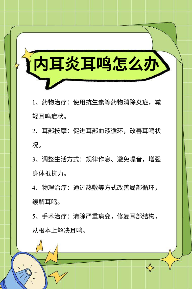 内耳炎耳鸣可通过药物治疗、耳部按摩、调整生活方式、物理治疗、手术治疗等方法来缓解。