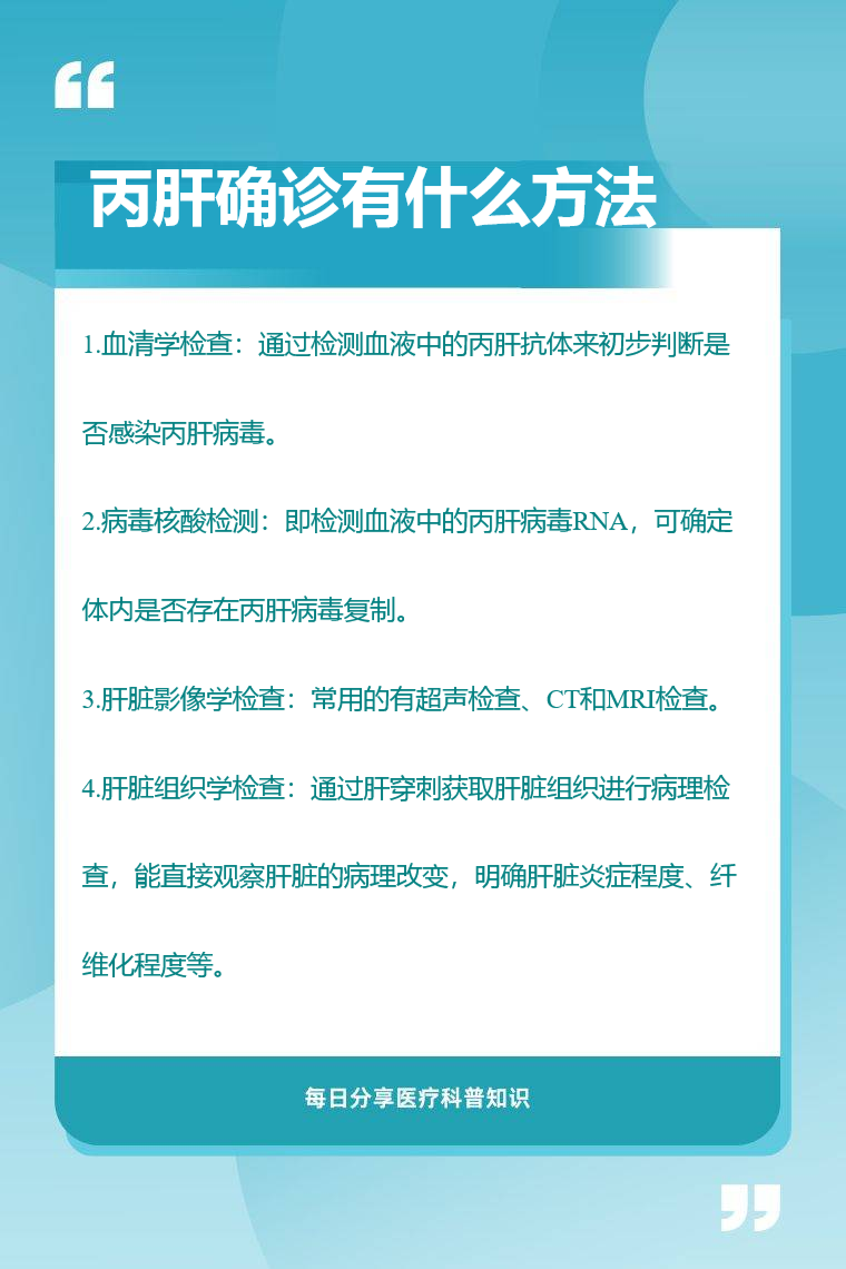 丙肝确诊方法有血清学检查、病毒核酸检测、肝脏影像学检查、肝脏组织学检查等。