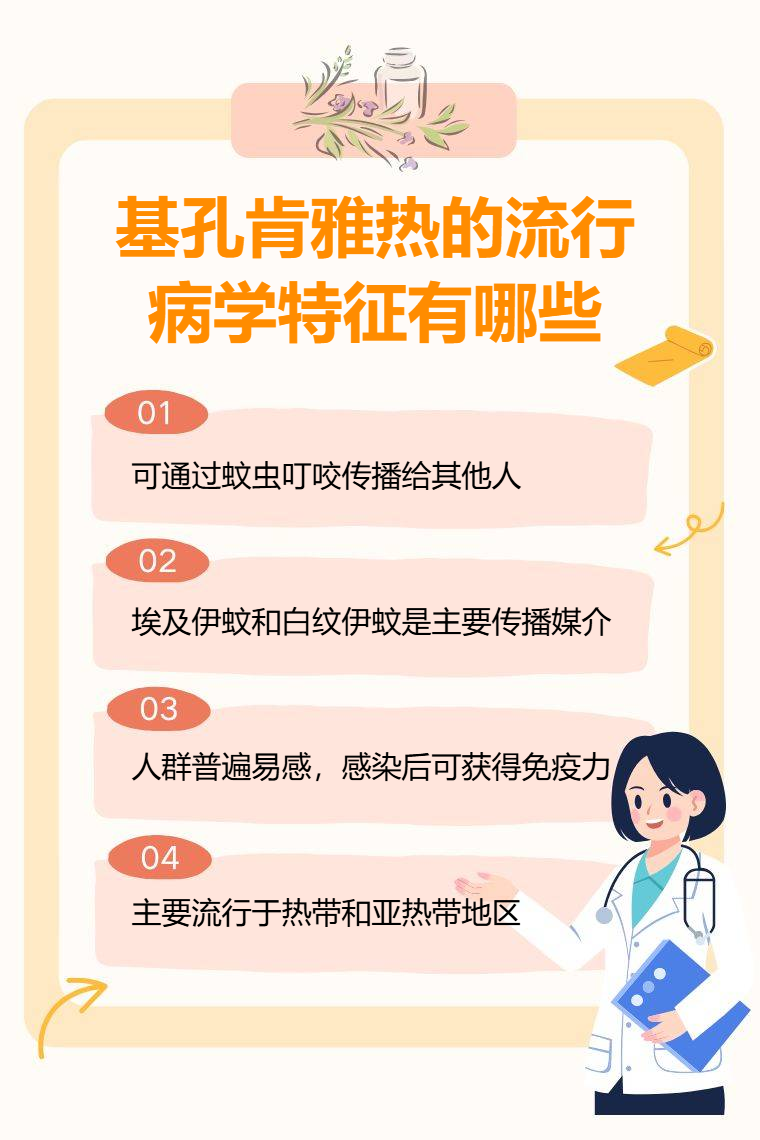 基孔肯雅热的流行病学特征包括传染源、传播途径、易感人群、流行特征等。