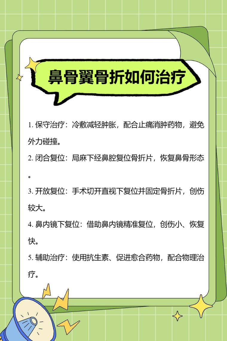 鼻骨翼骨折的治疗方法有保守治疗、闭合复位、开放复位、鼻内镜下复位、辅助治疗等。