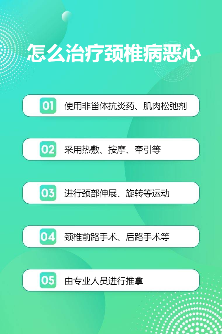 治疗颈椎病恶心可通过药物治疗、物理治疗、运动疗法、手术治疗、中医推拿等。
