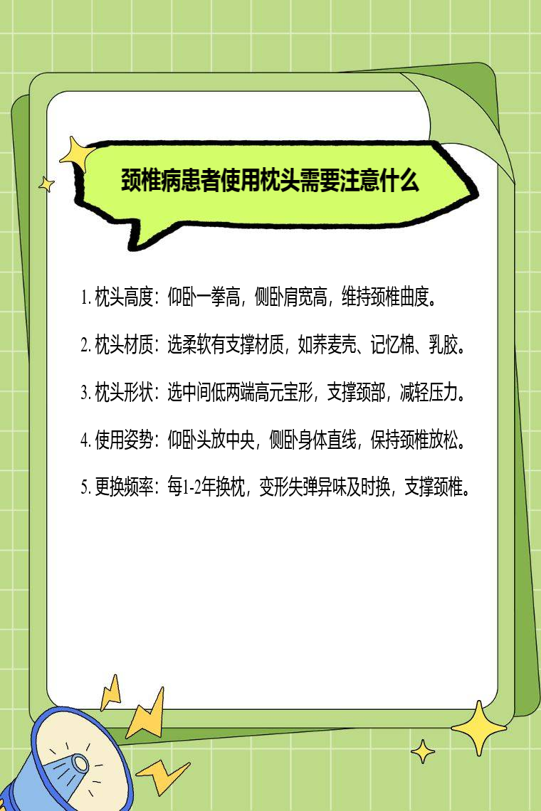 颈椎病患者使用枕头需要注意枕头高度、枕头材质、枕头形状、使用姿势、更换频率等。