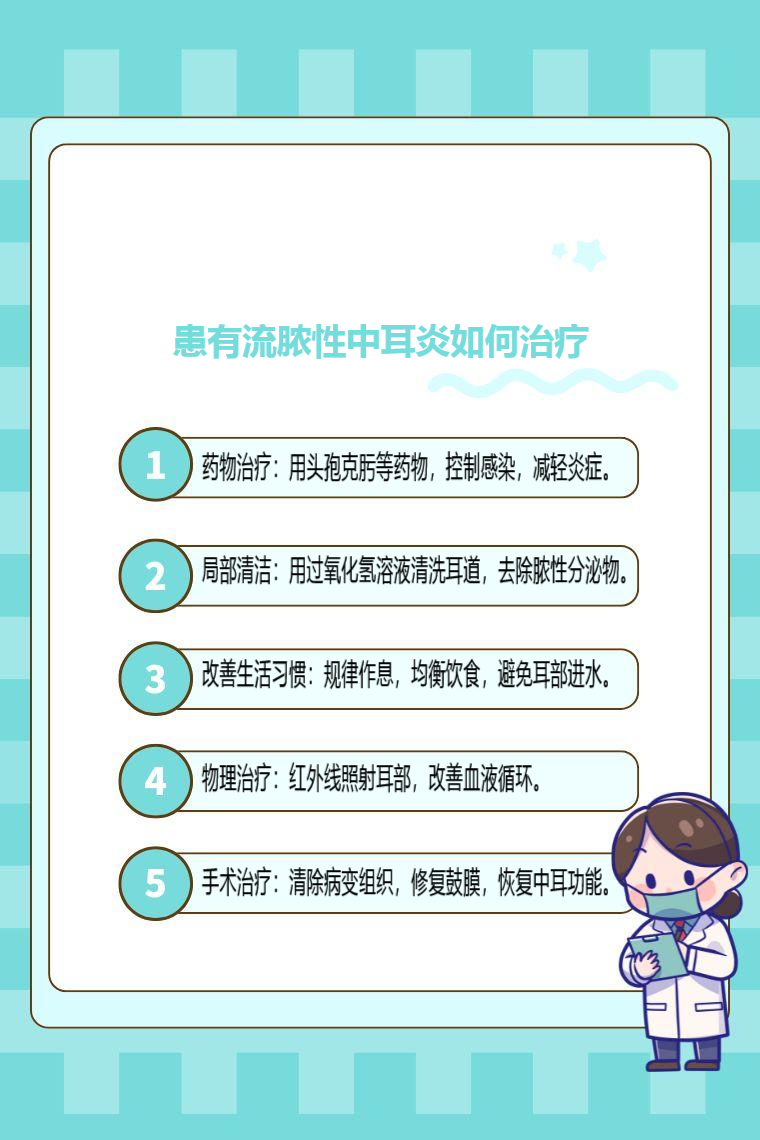 患有流脓性中耳炎的治疗方法主要有药物治疗、局部清洁、改善生活习惯、物理治疗、手术治疗等。