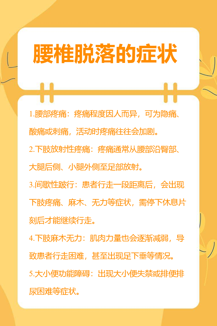 腰椎脱落的症状包括腰部疼痛、下肢放射性疼痛、间歇性跛行、下肢麻木无力、大小便功能障碍等。