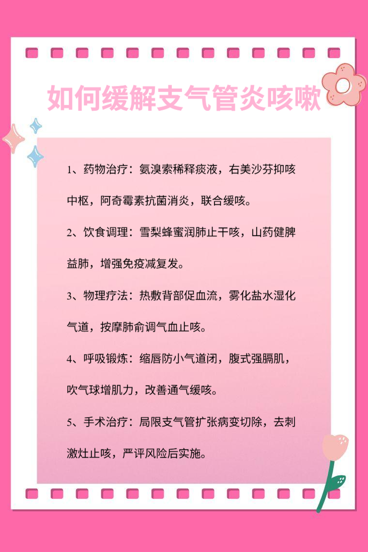 1. 药物治疗:支气管炎咳嗽多因炎症刺激,药物可减轻炎症、抑制咳嗽反射。遵医嘱使用氨溴索口服液,能稀释痰液,促进排出,减轻对气道刺激;右美沙芬糖浆可抑制延髓咳嗽中枢,缓解咳嗽;阿奇霉素胶囊能有效抑制病原体,减轻炎症,从而缓解咳嗽症状。