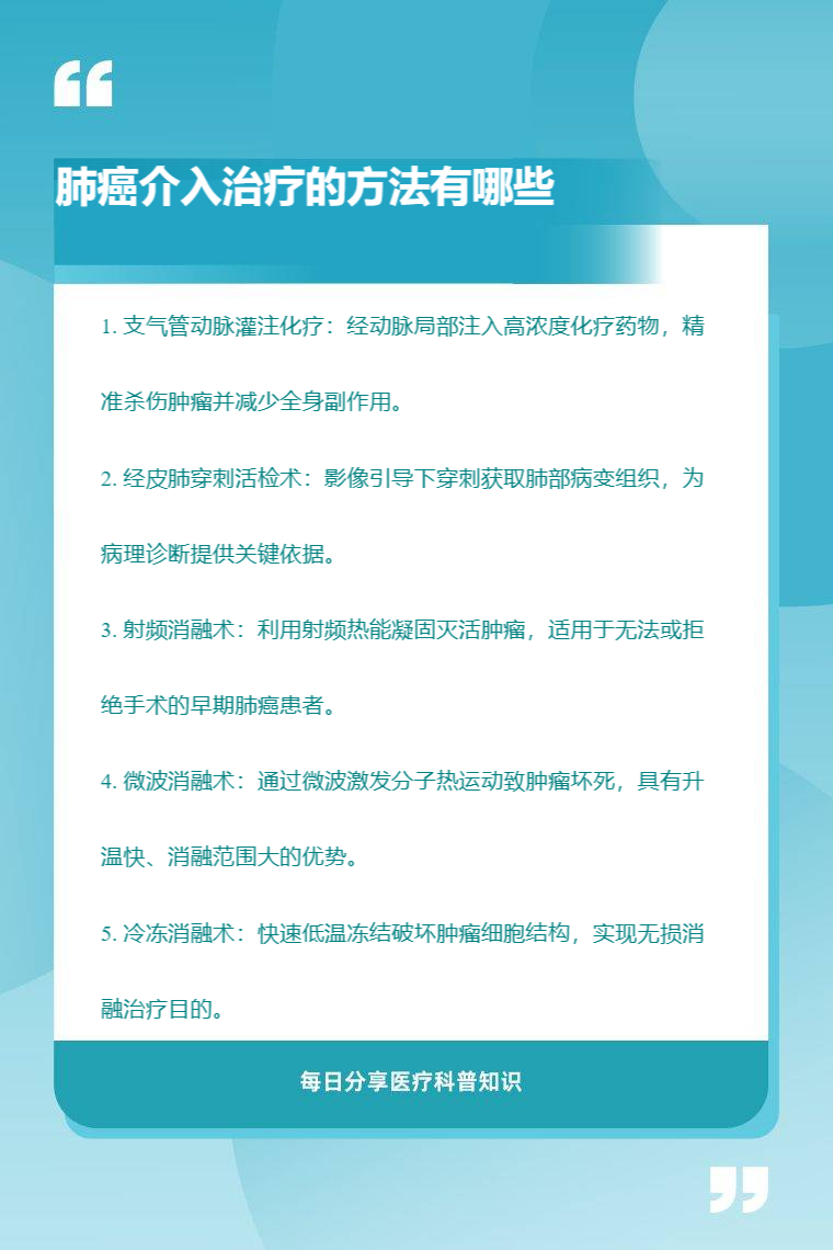肺癌介入治疗的方法有支气管动脉灌注化疗、经皮肺穿刺活检术、射频消融术、微波消融术、冷冻消融术等。