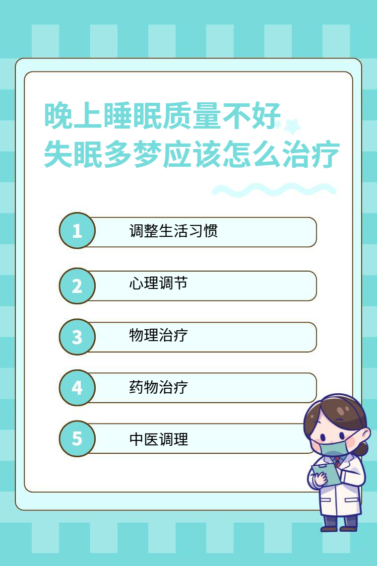 晚上睡眠质量不好失眠多梦可通过调整生活习惯、心理调节、物理治疗、药物治疗、中医调理等方法进行治疗。