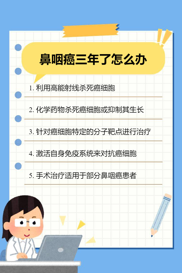 鼻咽癌三年可通过放疗、化疗、靶向治疗、免疫治疗、手术治疗等控制病情发展、缓解症状。