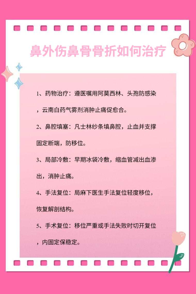 鼻外伤鼻骨骨折的治疗方法有药物治疗、鼻腔填塞、局部冷敷、手法复位、手术复位等。
