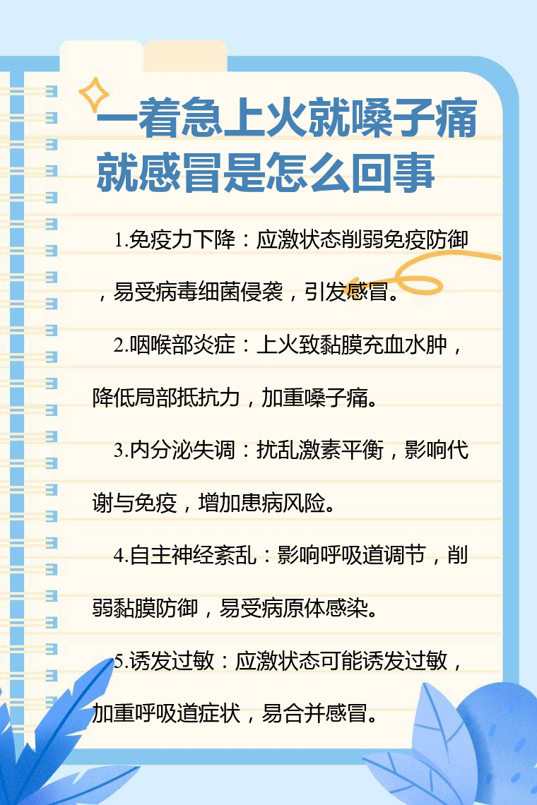 1. 免疫力下降:着急上火时,身体处于应激状态,会影响免疫系统正常功能,导致免疫力降低。此时,外界的病毒、细菌等病原体更容易侵入人体,引发嗓子痛和感冒症状。比如在长期精神压力大、情绪焦虑着急上火后,免疫系统的防御能力变弱,原本存在于呼吸道的病菌大量繁殖,从而引发疾病。
