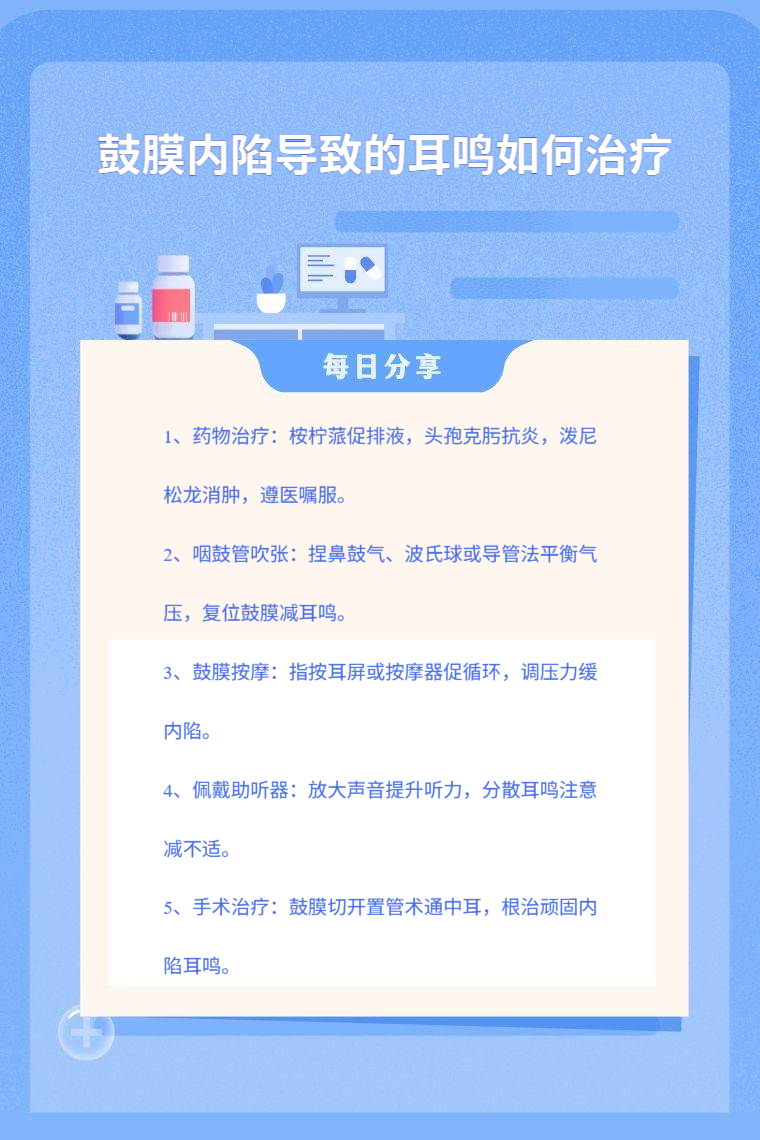 5. 手术治疗:当保守治疗无效时考虑。如鼓膜切开术、鼓膜置管术等,通过手术改善中耳通气引流,纠正鼓膜内陷,从根本上解决耳鸣问题。