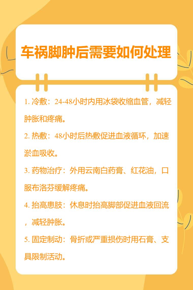 车祸脚肿后可通过冷敷、热敷、药物治疗、抬高患肢、固定制动等处理。