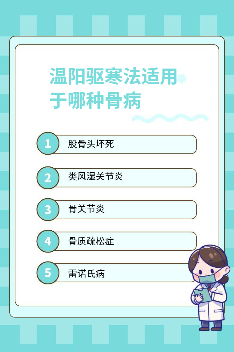 温阳驱寒法适用于股骨头坏死、类风湿关节炎、骨关节炎、骨质疏松症、雷诺氏病等骨病。