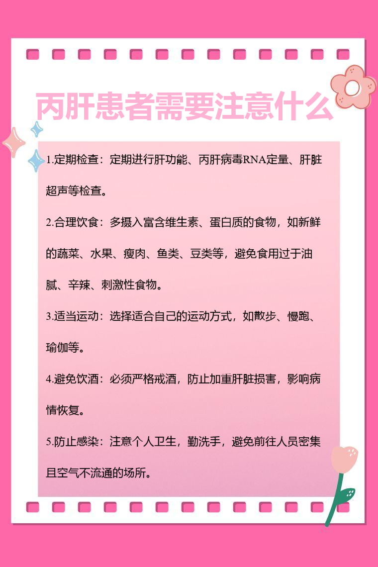 丙肝患者需要注意定期检查、合理饮食、适当运动、避免饮酒、防止感染等。