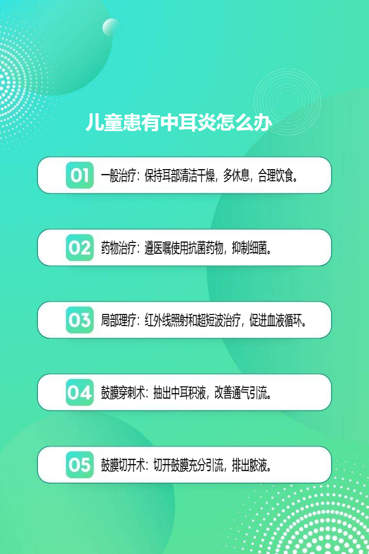 儿童患有中耳炎可通过一般治疗、药物治疗、局部理疗、鼓膜穿刺术、鼓膜切开术等方法应对。