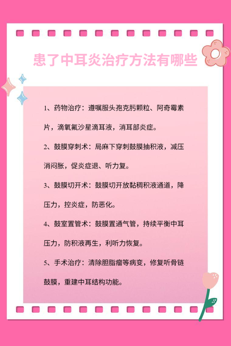 中耳炎的治疗方法有药物治疗、鼓膜穿刺术、鼓膜切开术、鼓室置管术、手术治疗等。