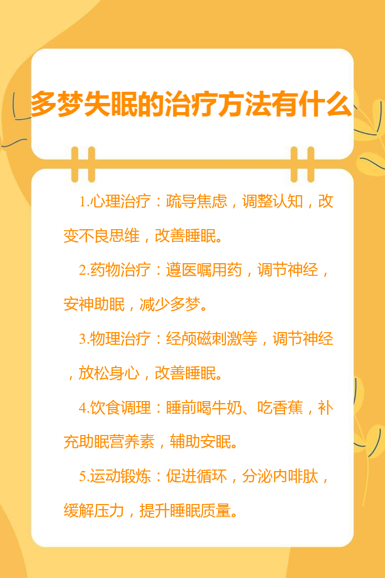 多梦失眠的治疗方法有心理治疗、药物治疗、物理治疗、饮食调理、运动锻炼等。