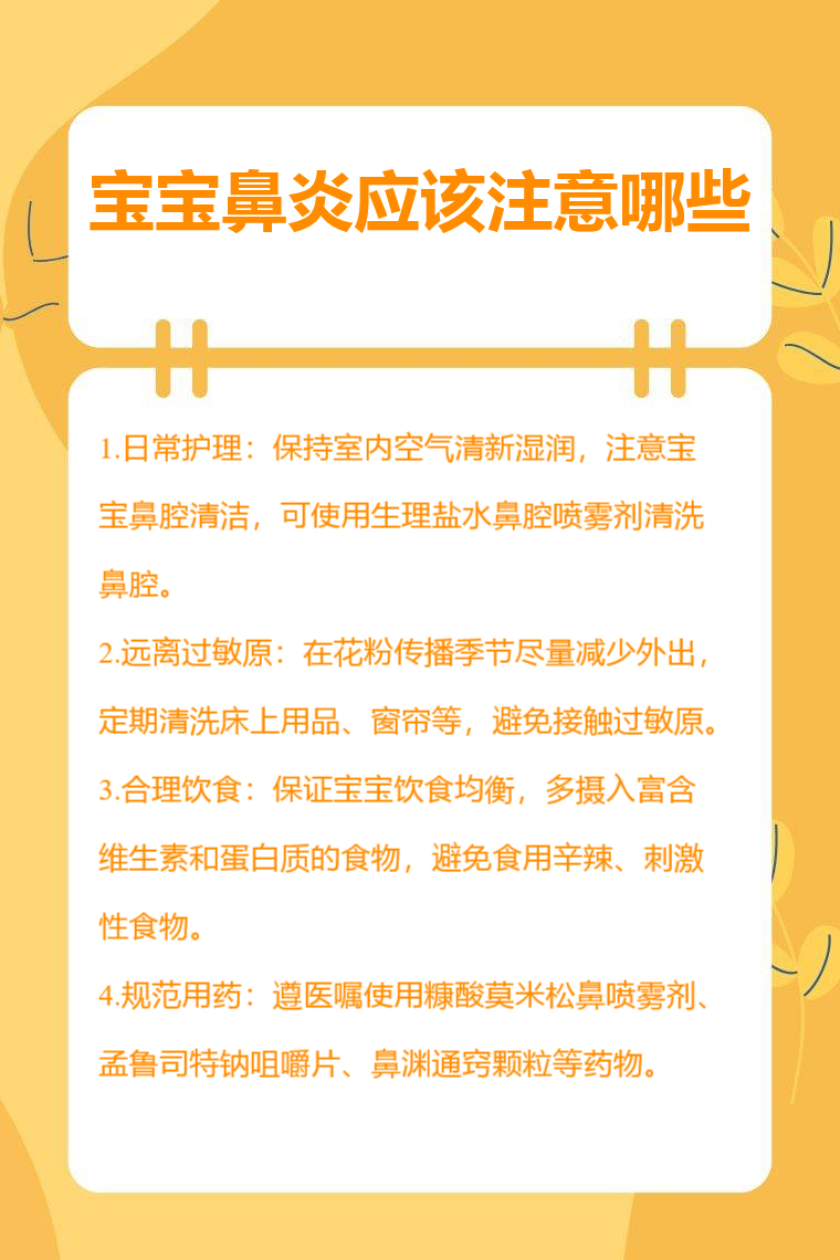 宝宝鼻炎需要注意日常护理、远离过敏原、合理饮食、规范用药等。