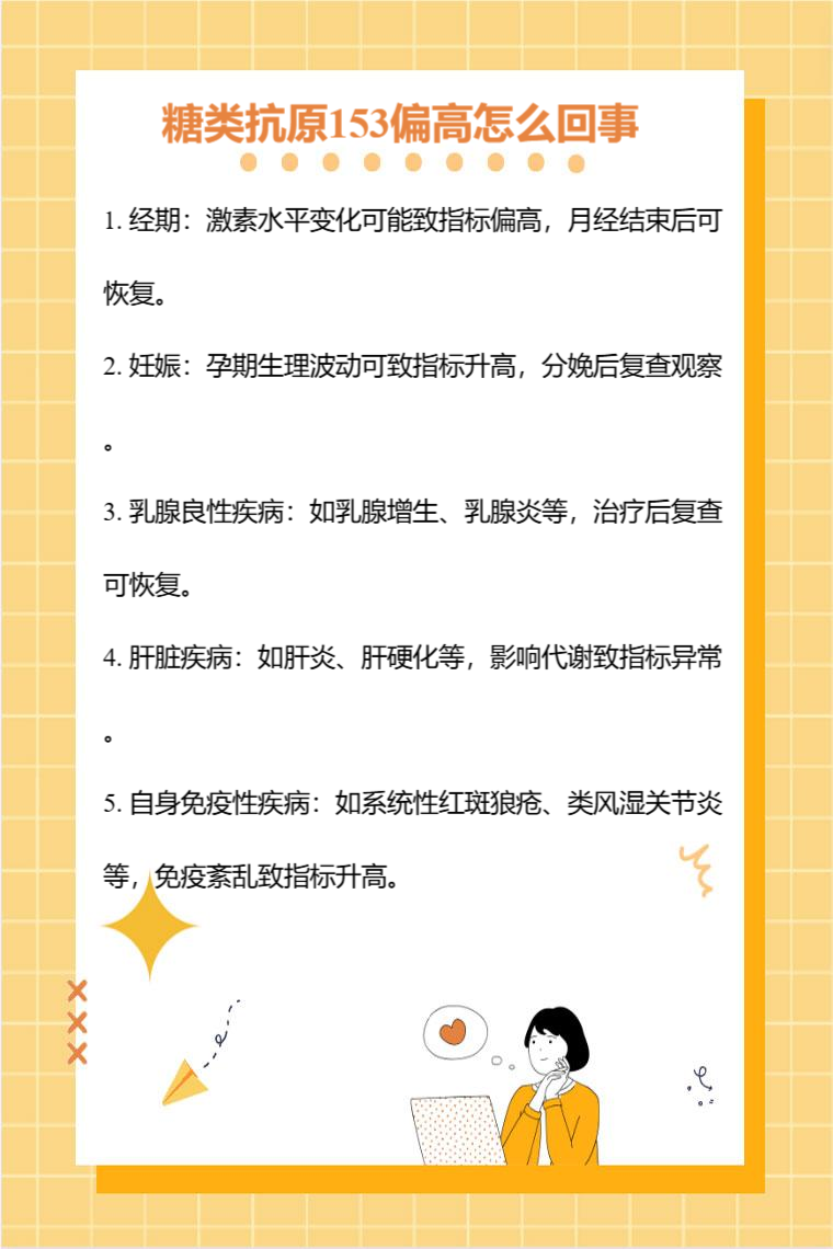 糖类抗原153偏高可能由经期、妊娠、乳腺良性疾病、肝脏疾病、自身免疫性疾病等情况导致。