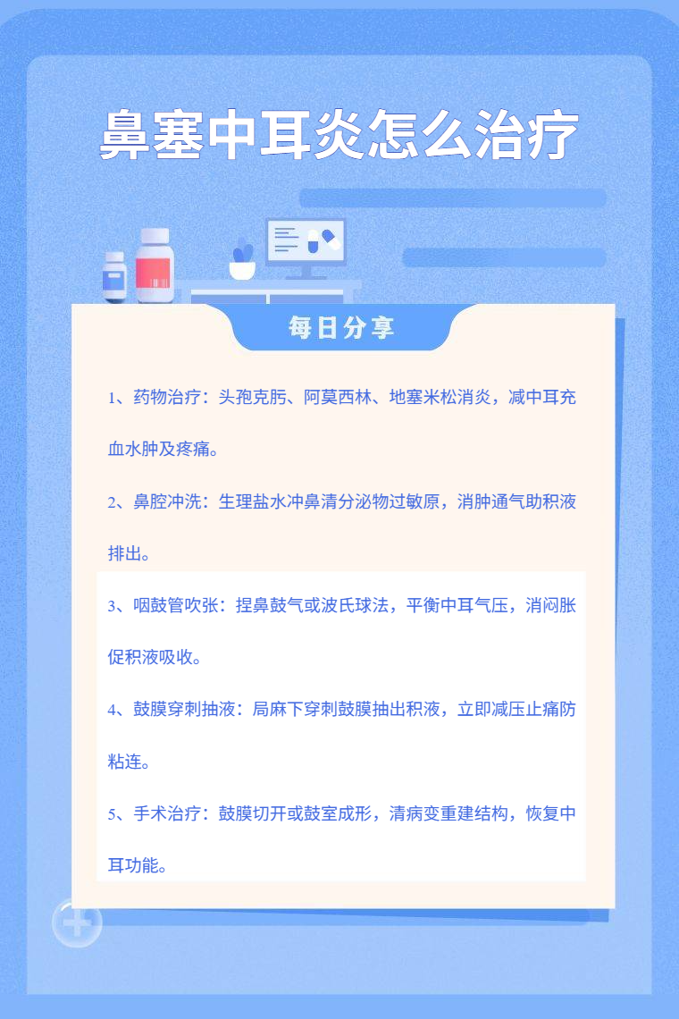 鼻塞中耳炎的治疗方法有药物治疗、鼻腔冲洗、咽鼓管吹张、鼓膜穿刺抽液、手术治疗等。