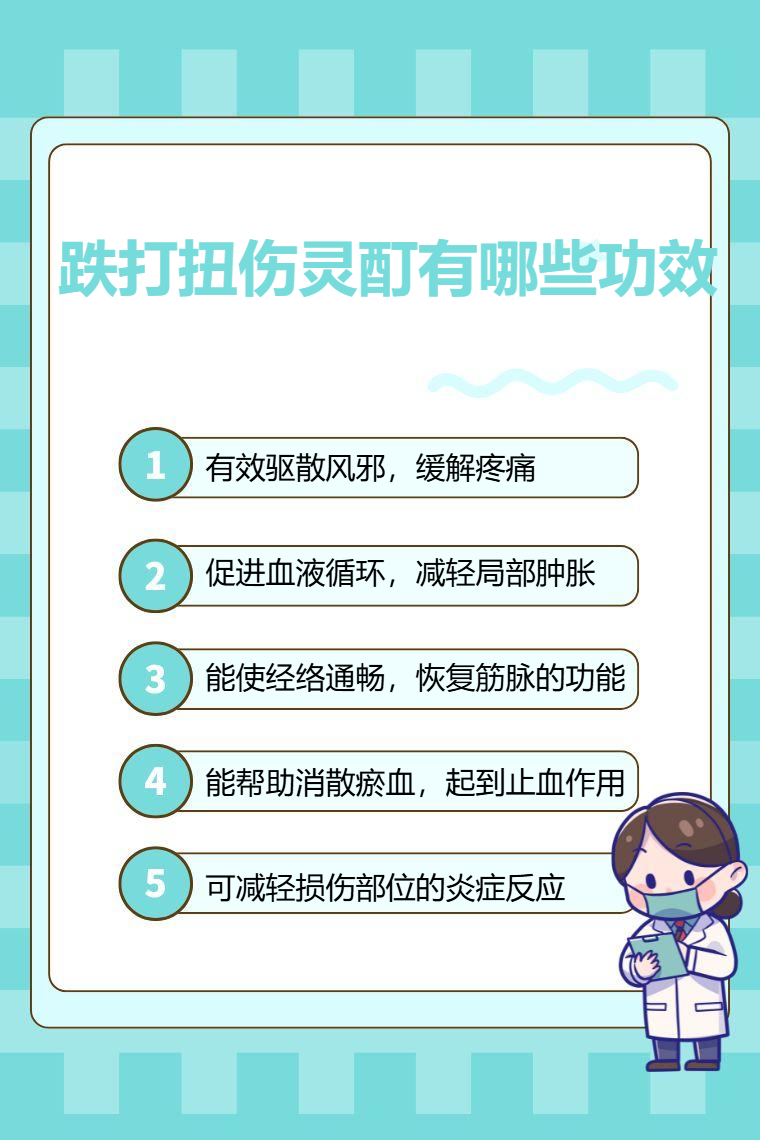 跌打扭伤灵酊具有祛风止痛、活血消肿、舒筋活络、散瘀止血、抗炎等功效。