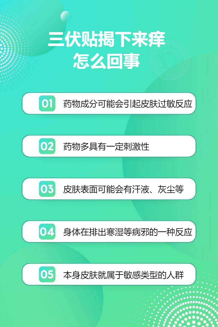 三伏贴揭下来痒可能是皮肤过敏、药物刺激、皮肤清洁不当、排病反应、皮肤过于敏感等情况。