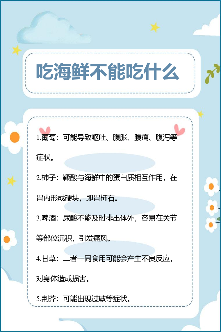 吃海鲜时一般不能吃葡萄、柿子、啤酒、甘草、荆芥等。