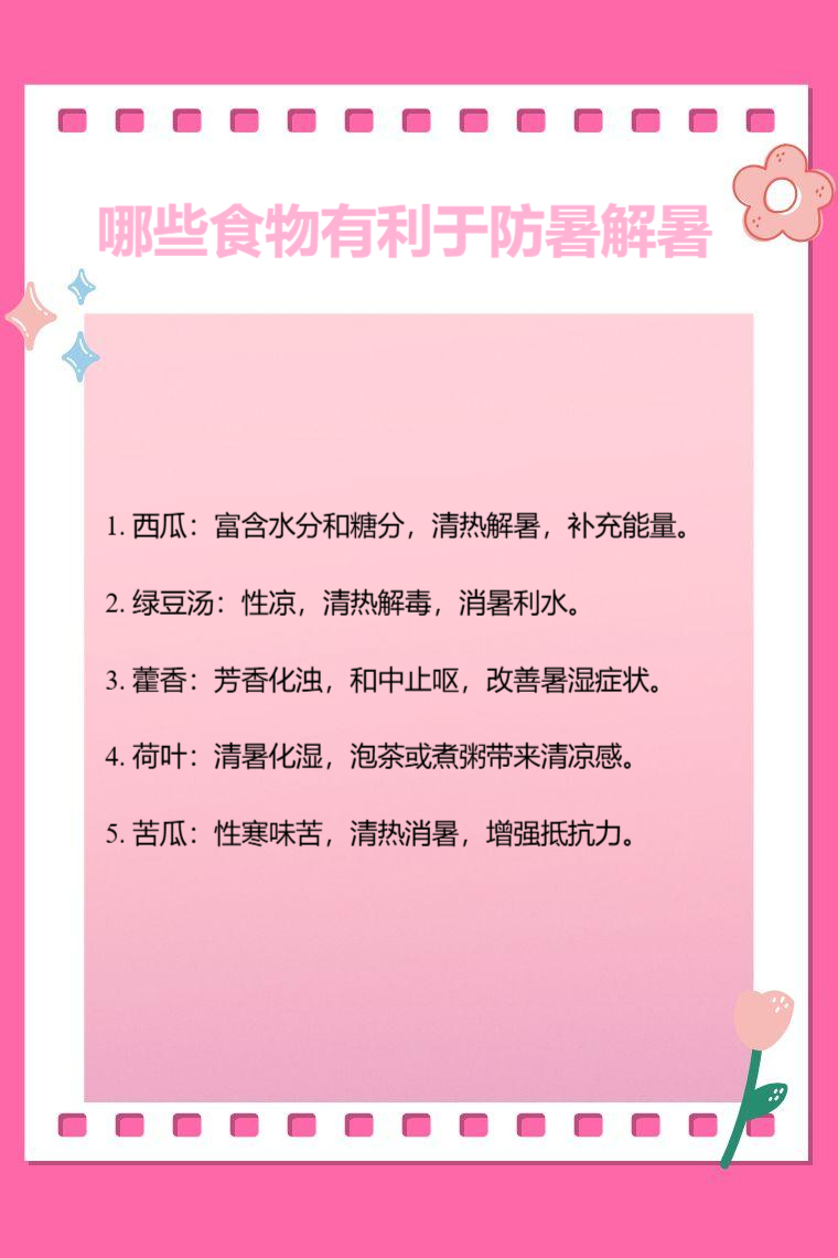 西瓜、绿豆汤、藿香、荷叶、苦瓜等食物有利于防暑解暑。