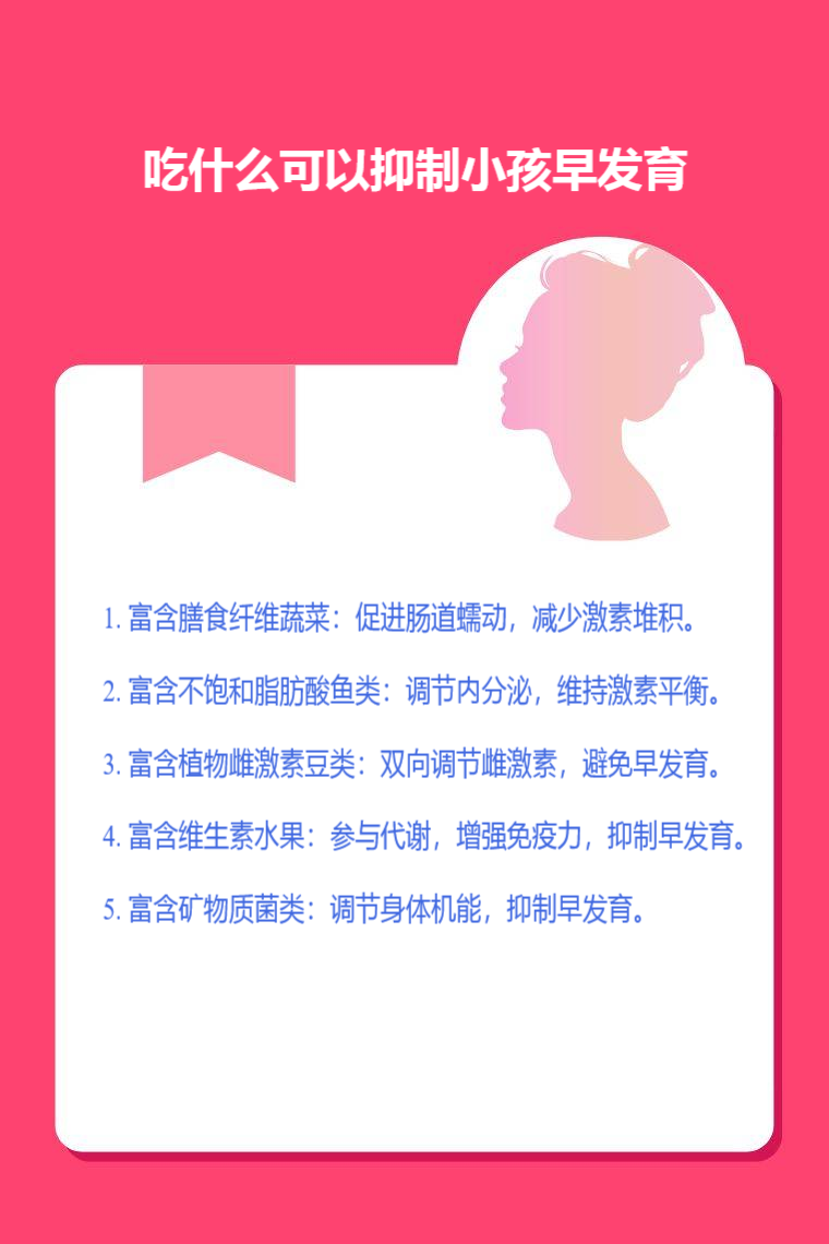 小孩早发育可通过食用富含膳食纤维的蔬菜、富含不饱和脂肪酸的鱼类、富含植物雌激素的豆类及豆制品、富含维生素的水果、富含矿物质的菌类等抑制。