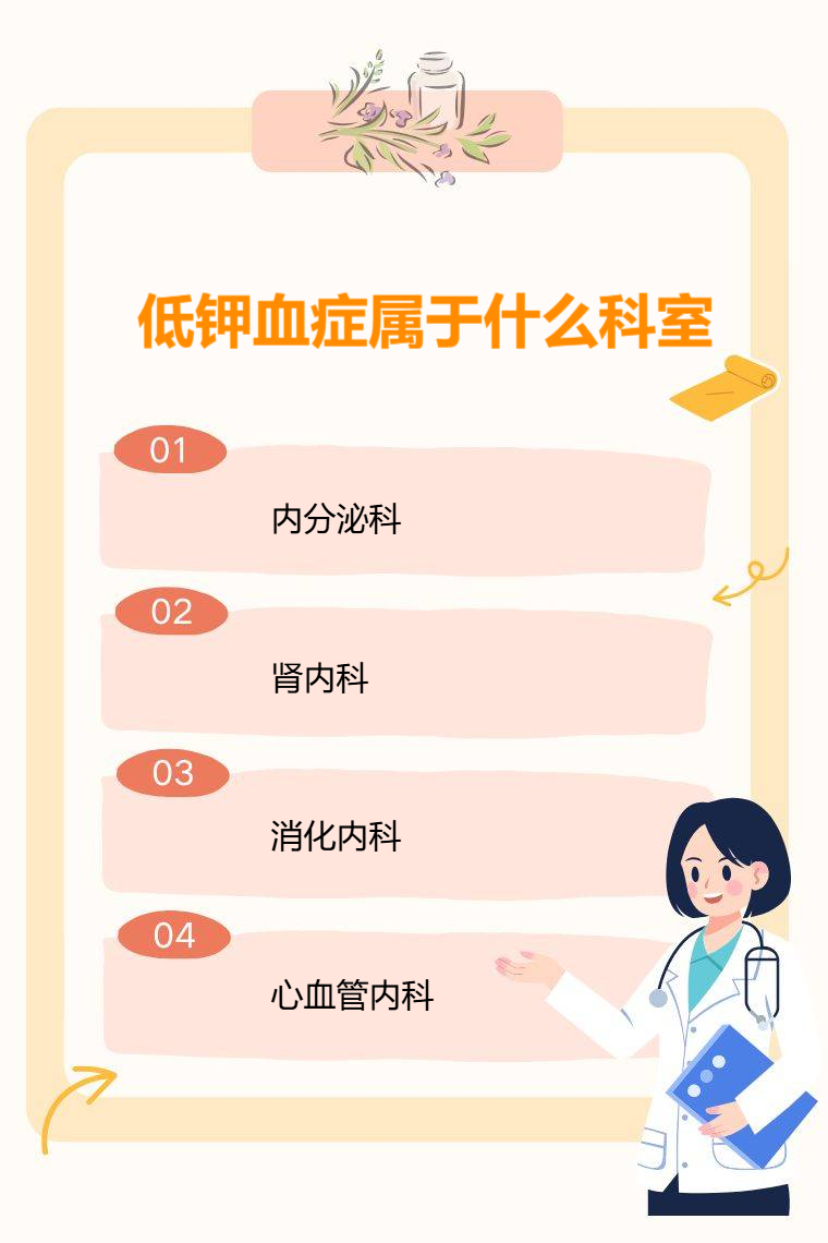 低钾血症可就诊于内分泌科、肾内科、消化内科、心血管内科等。