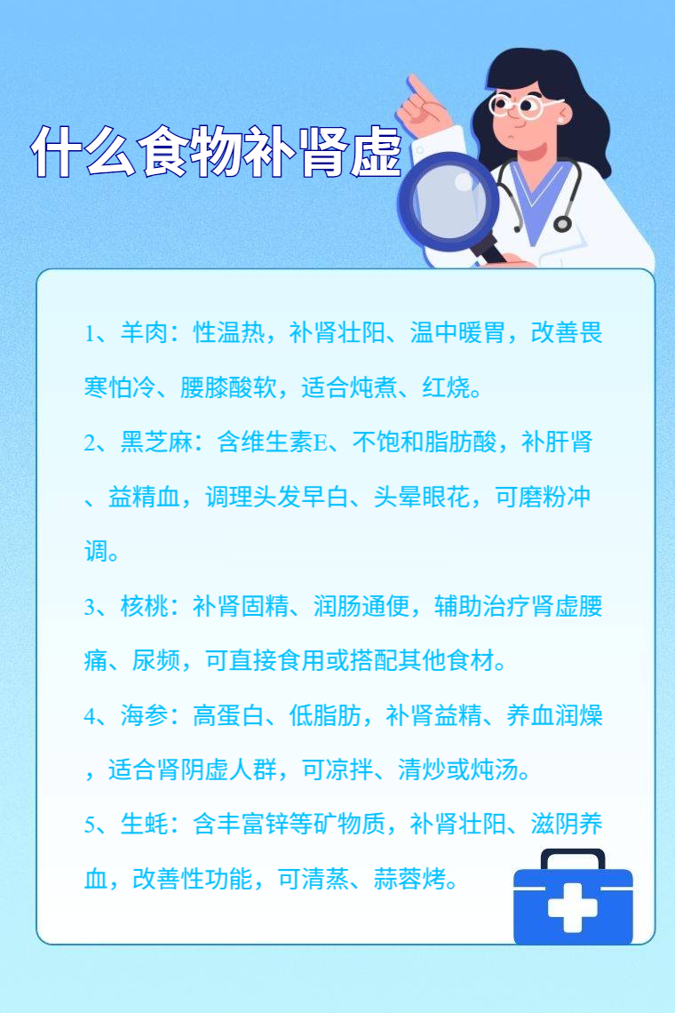 羊肉、黑芝麻、核桃、海参、生蚝等食物可补肾虚。