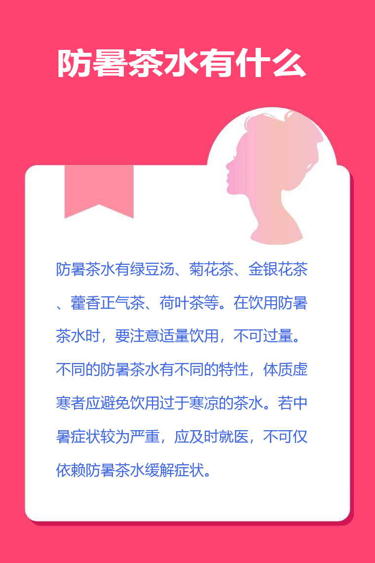 防暑茶水有绿豆汤、菊花茶、金银花茶、藿香正气茶、荷叶茶等。