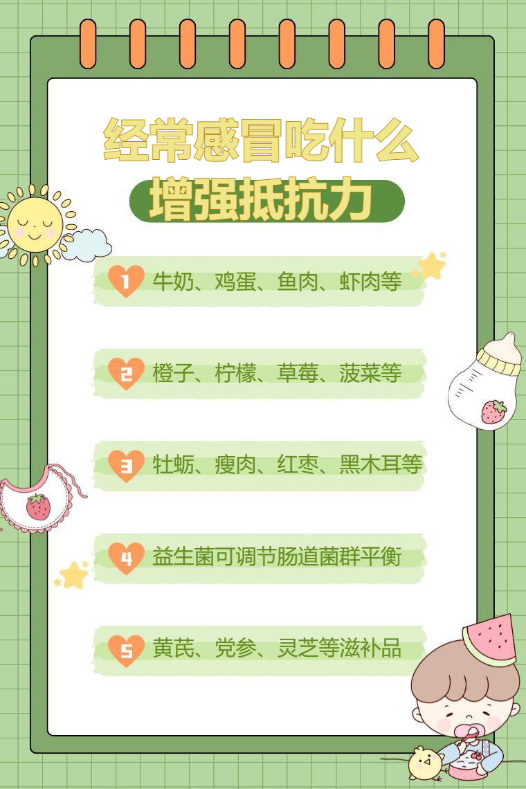 经常感冒可通过摄入富含蛋白质食物、维生素食物、矿物质食物、益生菌食物、中药滋补品等增强抵抗力。