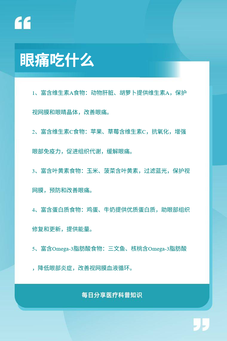 眼痛可通过食用富含维生素A、维生素C、叶黄素、蛋白质、Omega-3脂肪酸等食物来缓解。