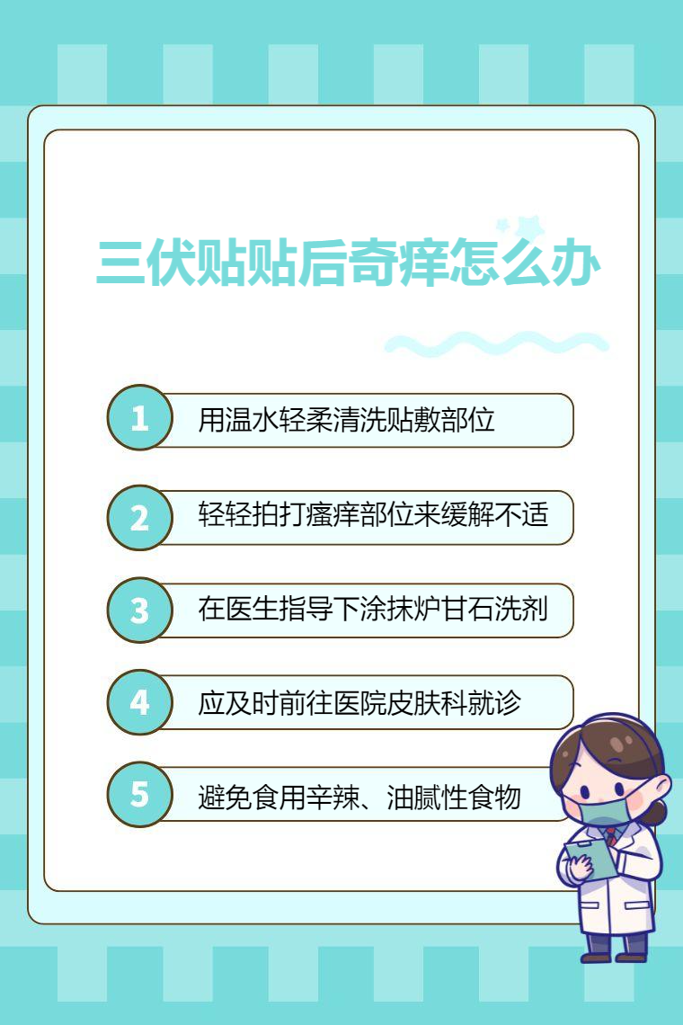三伏贴贴后奇痒可通过清洁皮肤、避免抓挠、涂抹药物、就医诊治、调整饮食等处理。