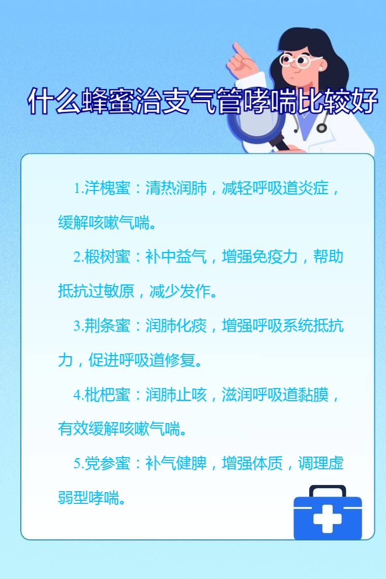 洋槐蜜、椴树蜜、荆条蜜、枇杷蜜、党参蜜等对支气管哮喘可能有一定益处。
