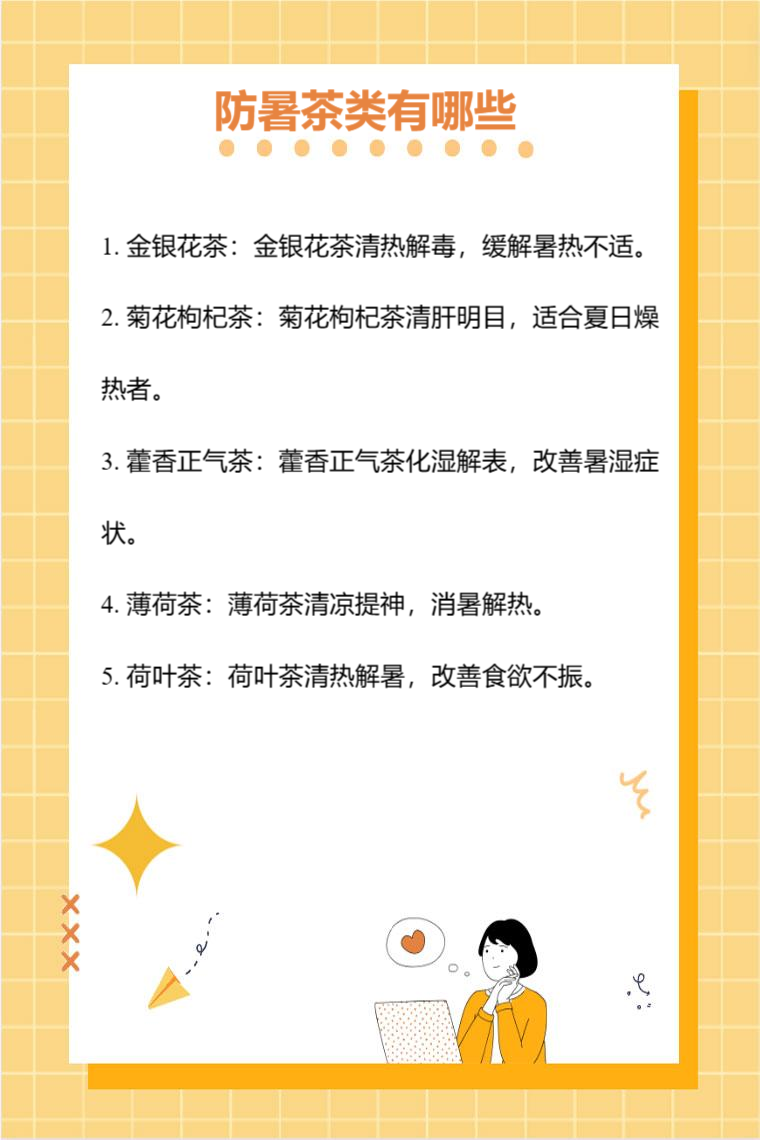 防暑茶类有金银花茶、菊花枸杞茶、藿香正气茶、薄荷茶、荷叶茶等。