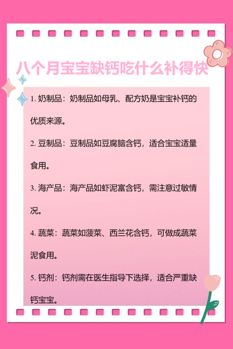 5. 钙剂:若宝宝缺钙较为严重,可在医生指导下选择合适的钙剂进行补充。钙剂的种类多样,要根据宝宝年龄和身体状况选择易于吸收的钙剂。