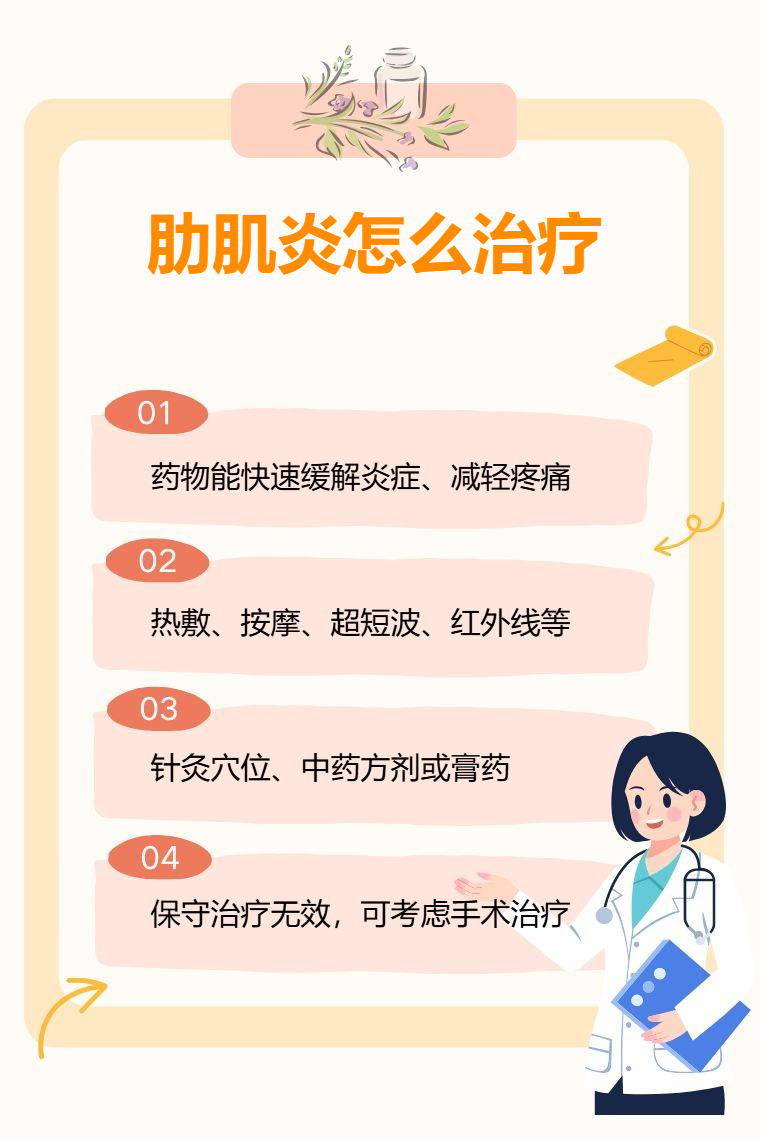 肋肌炎的治疗方法有药物治疗、物理治疗、中医治疗、手术治疗等。