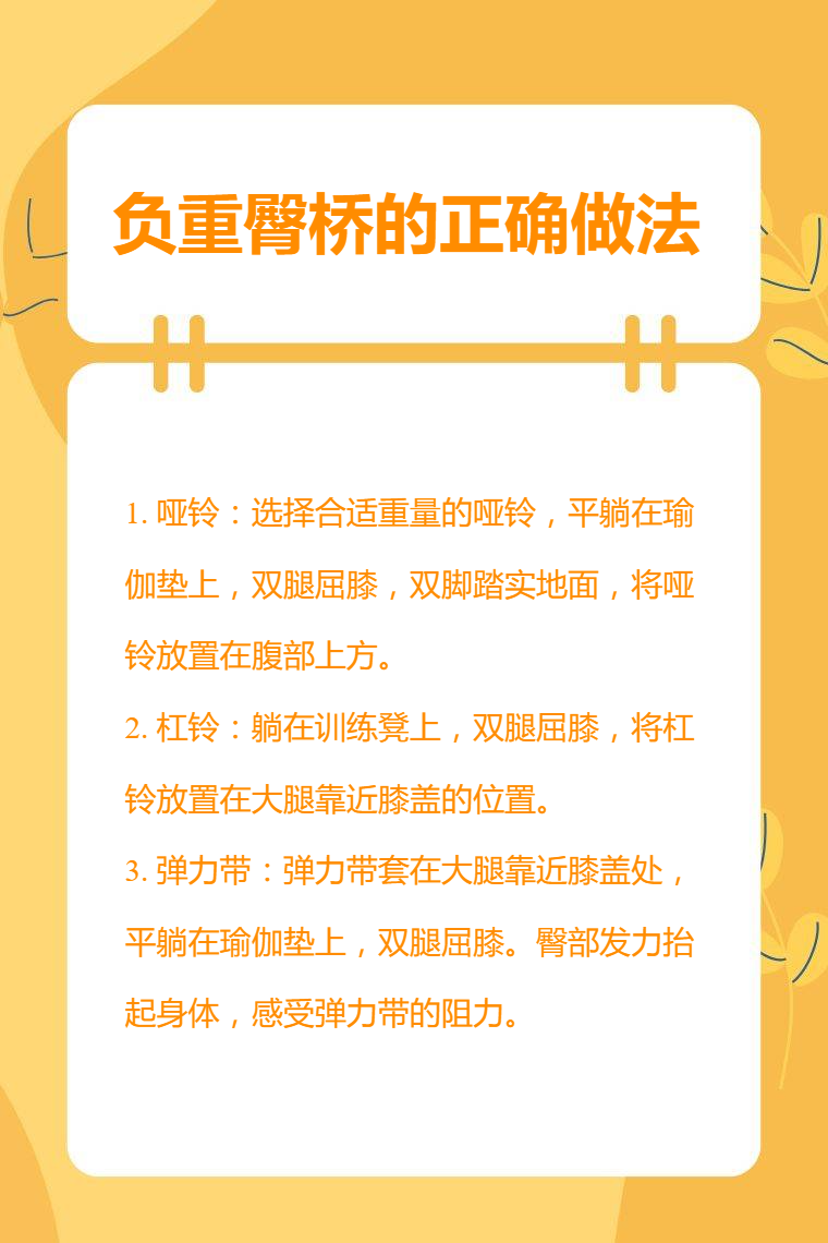 进行负重臀桥训练时,要根据自身身体状况和运动能力选择合适的负重方式和重量。训练前充分热身,训练过程中保持正确的动作姿势,避免因姿势不当造成身体损伤。如果在训练过程中感到不适,应立即停止训练,必要时寻求专业人士的指导或咨询医生的建议 。