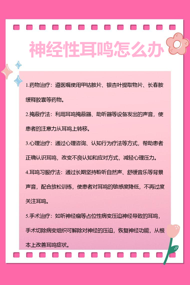 神经性耳鸣可通过药物治疗、掩蔽疗法、心理治疗、耳鸣习服疗法、手术治疗等方法应对。