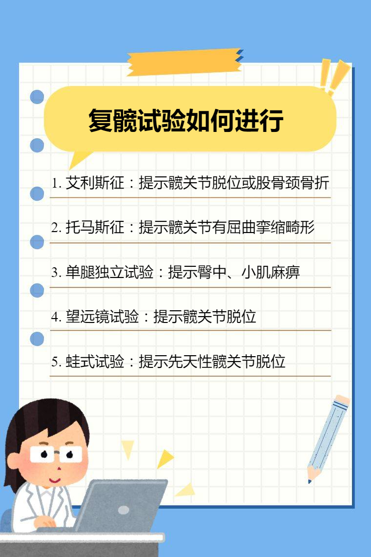 复髋试验包括艾利斯征、托马斯征、单腿独立试验、望远镜试验、蛙式试验等。
