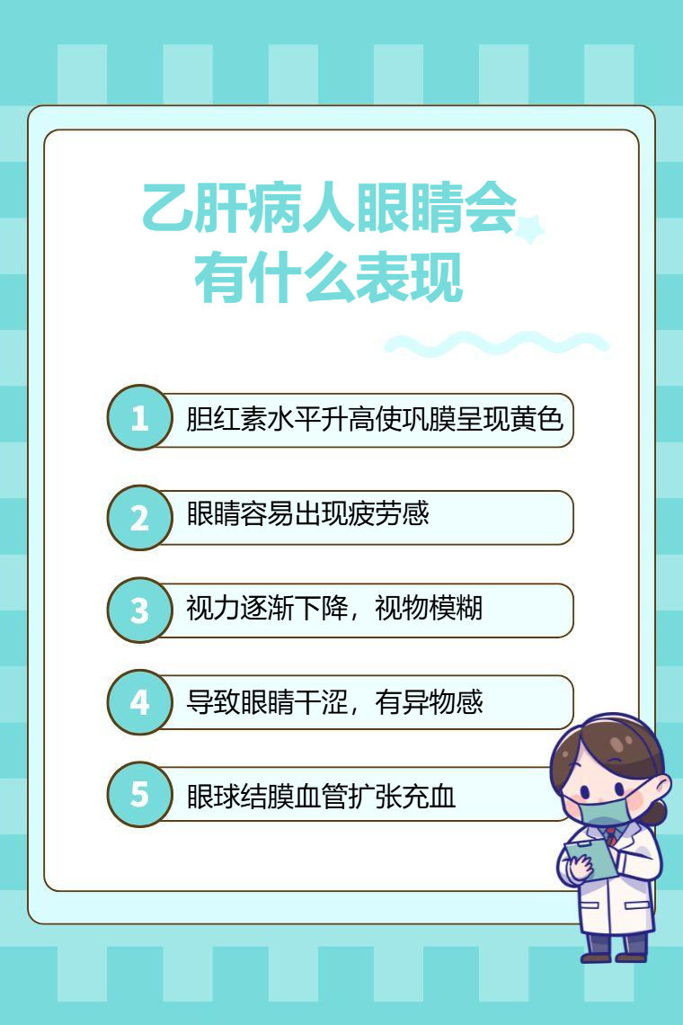 乙肝病人眼睛可能出现巩膜黄染、眼疲劳、视力下降、眼部干涩、眼球结膜充血等表现。