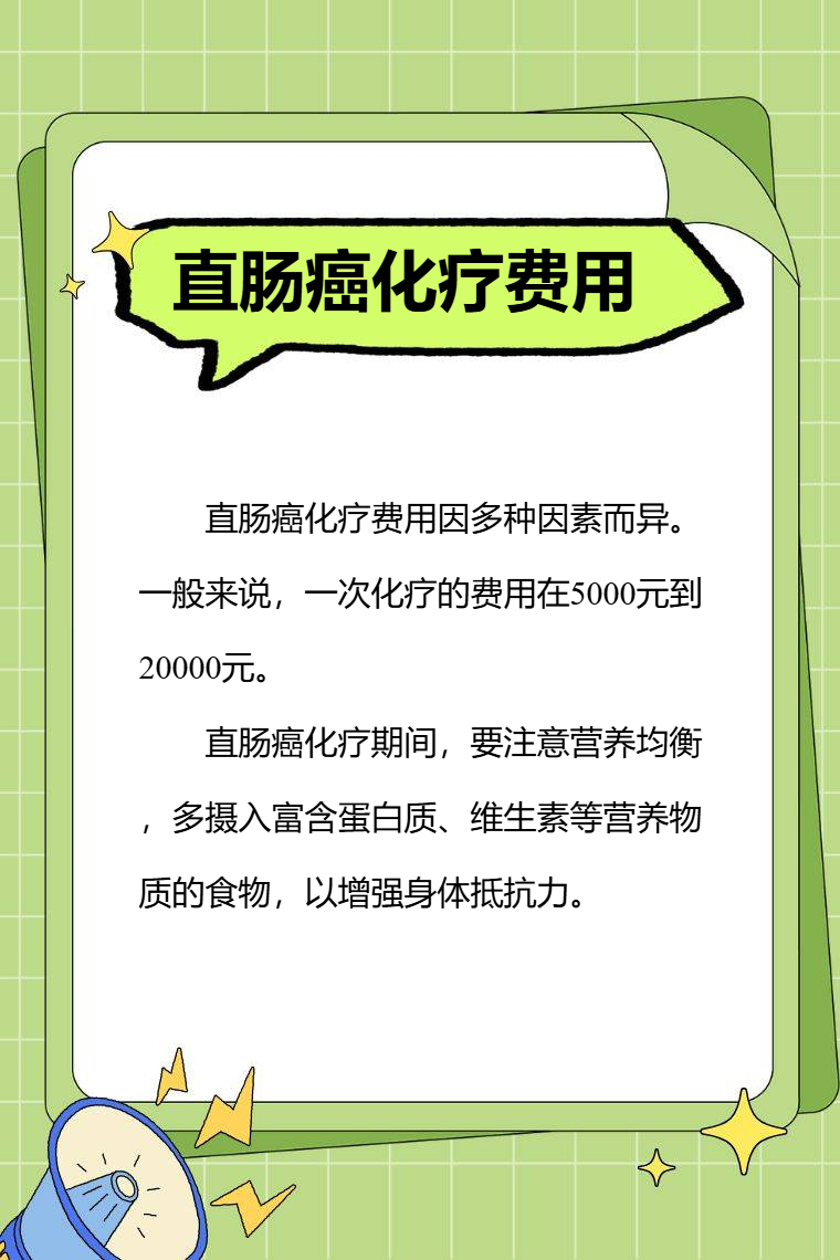 直肠癌化疗费用因多种因素而异。一般来说,一次化疗的费用在5000元到20000元。影响费用的因素主要有药物种类、治疗周期、病情严重程度、辅助治疗手段等。
