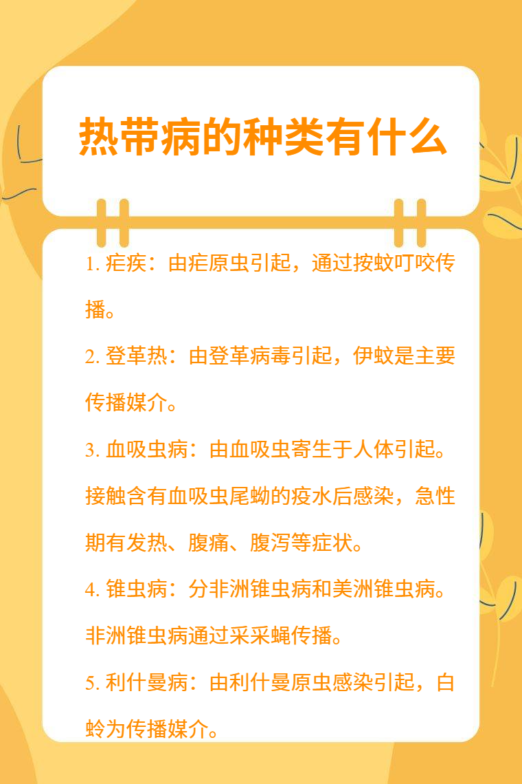 5. 利什曼病:由利什曼原虫感染引起,白蛉为传播媒介。根据病变部位不同分为皮肤利什曼病、黏膜皮肤利什曼病和内脏利什曼病,内脏利什曼病如不及时治疗病死率较高。