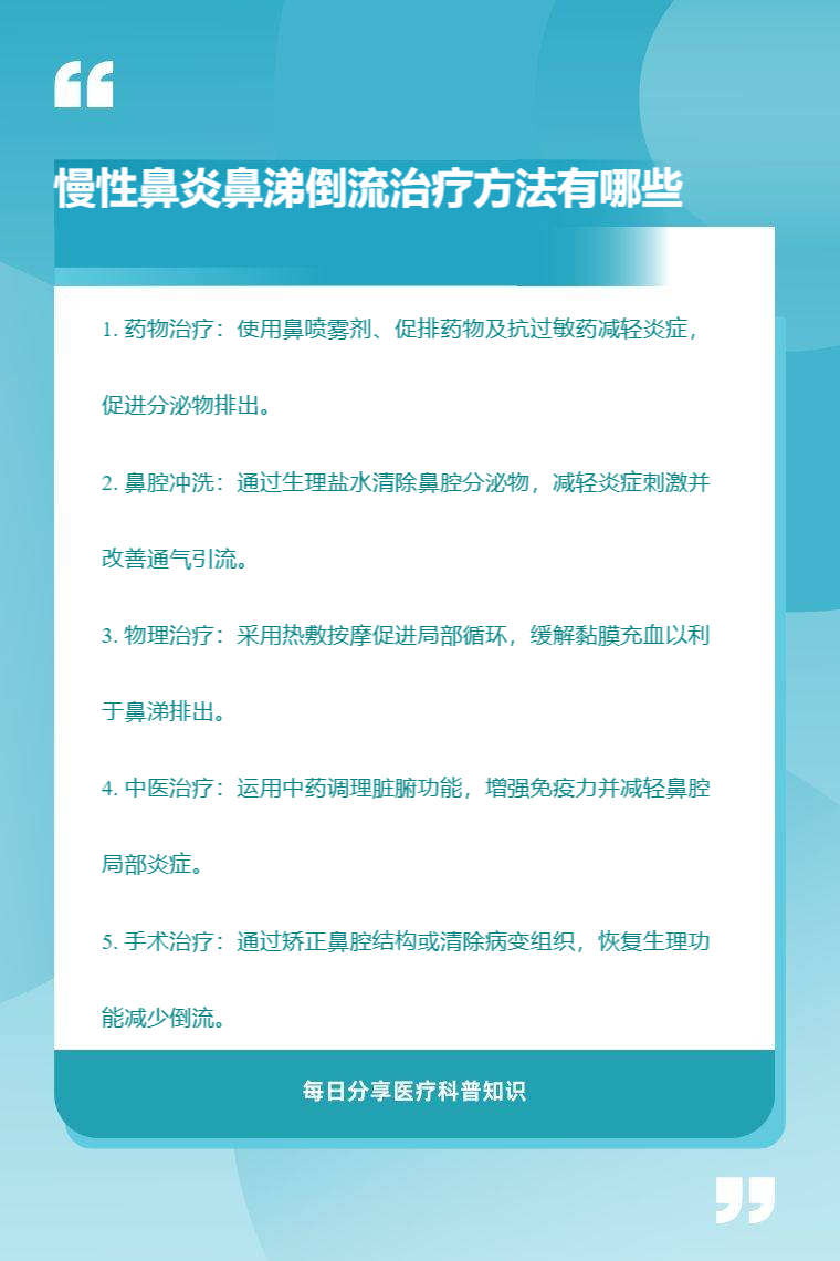 慢性鼻炎鼻涕倒流的治疗方法有药物治疗、鼻腔冲洗、物理治疗、中医治疗、手术治疗等。