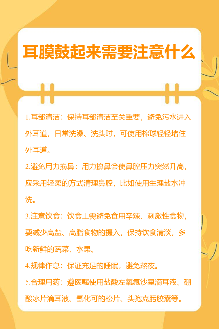耳膜鼓起来常见需注意的方面有耳部清洁、避免用力擤鼻、注意饮食、规律作息、合理用药等。